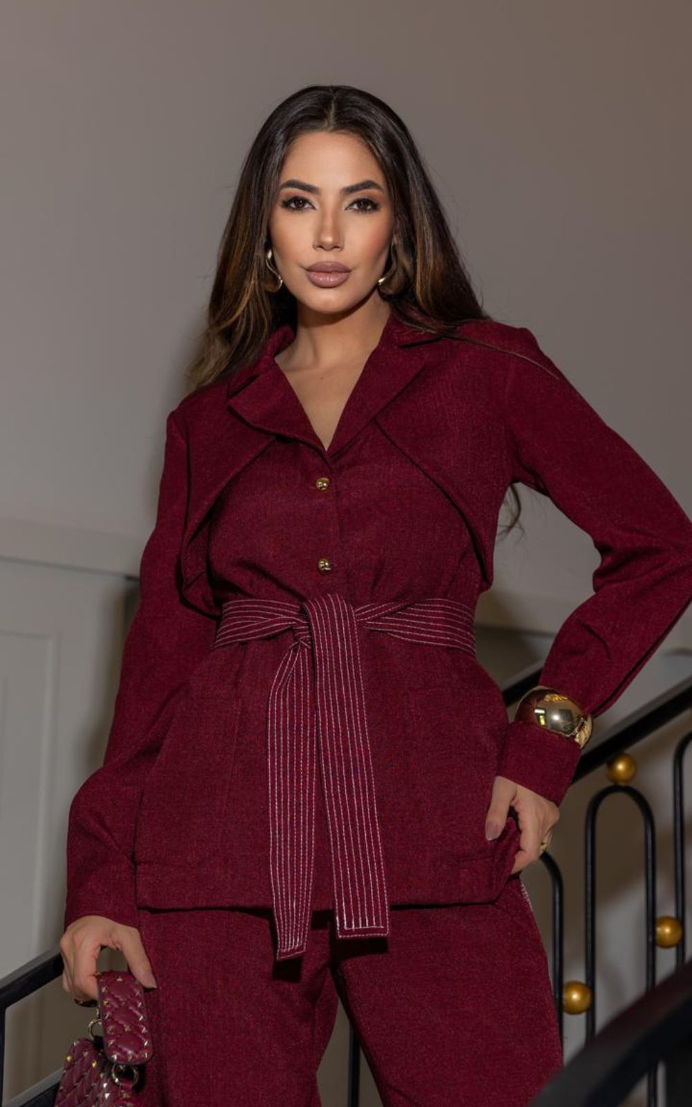 O Blazer Alfaiataria Manga Longa Com Lapela, foi confeccionado em Alfaiataria, Modelagem shape estruturado, levemente acinturado, valorizando a silhueta, decote em V com gola, possui bolsos frontais, manga longa, detalhes com lapela, e fechamento frontal por botões dourados. Acompanha cinto faixa para amarração, com detalhes de pesponto contrastante. Para deixa-la ainda mais lindo.