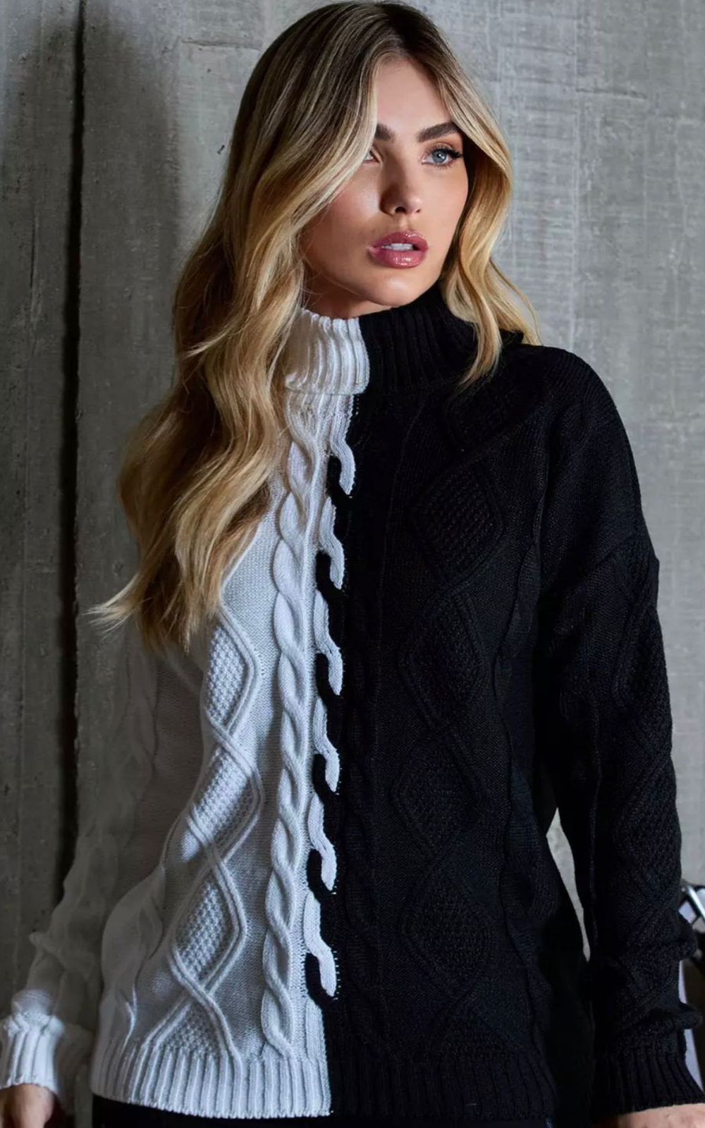 A Blusa Em Tricot Tranças Central Bicolor, foi confeccionada em tricot macio de toque suave ao corpo. Detalhes com tranças, em alto relevo forntal, bicolor (off-white e preto), canelada na gola, barra e punhos, gola alta, possui manga longa, um charme você tem que ter uma no seu guarda roupa.