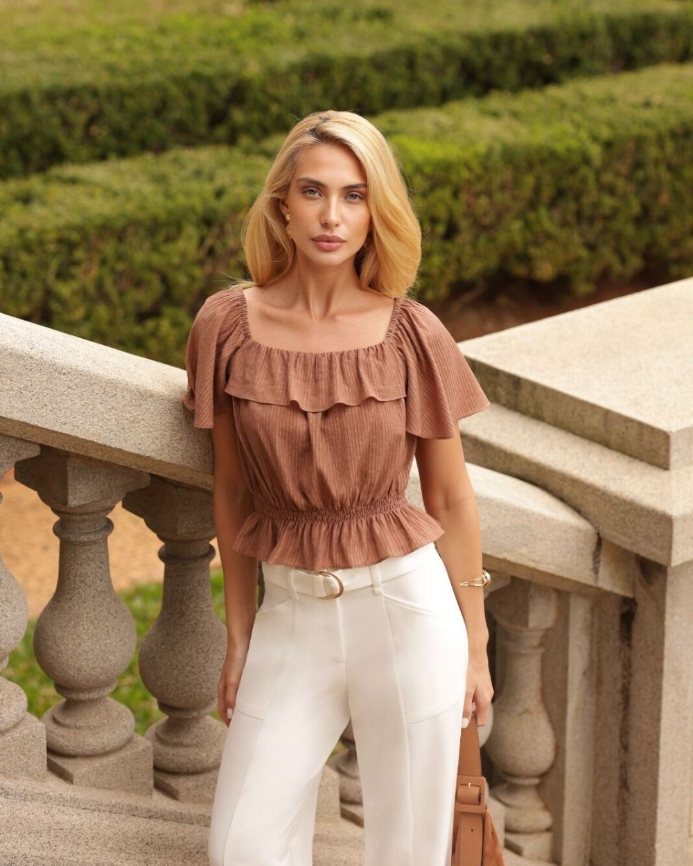 A Blusa Manga Godê Com Babados Doce Flor, foi confeccionada em viscose macio e de toque suave ao corpo. De modelagem solta e cropped, manga curta godê, possui decote reto com babados,com detalhes em elástico na cintura, para deixa-la ainda mais linda e elegante.