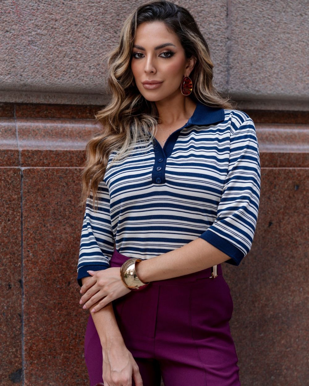 A Blusa Polo Moletinho Decote V, foi confeccionada em moletinho macio e de toque suave ao corpo. De modelagem justa, manga 7/8, gola polo, decote v, detalhes com listras, para deixa-la ainda mais linda.
