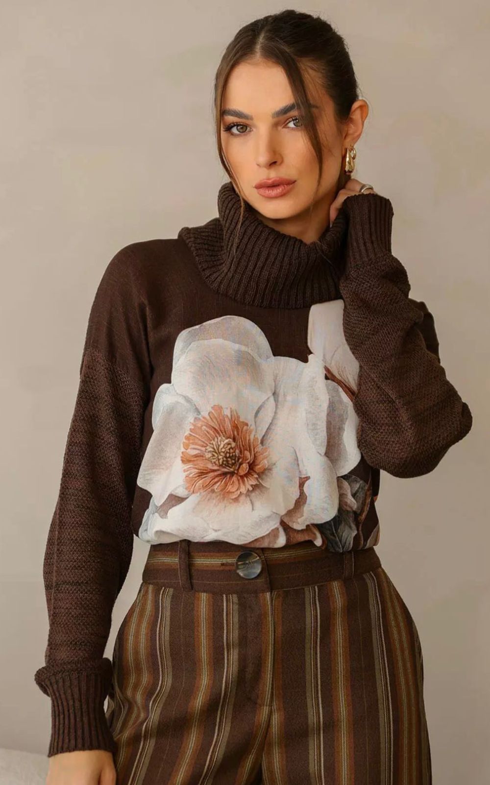 Blusa Tricot Gola Role E Manga Longa Com Estampa - Composição