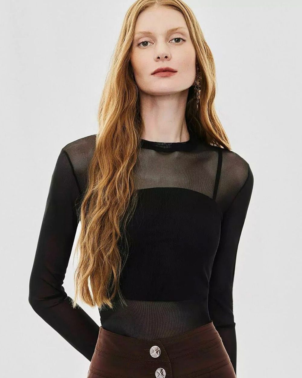 Blusa Tule Com Top Manga Longa Karmani, foi confeccionada em tecido tule exclusivo, macio de toque suave ao corpo, modelo justo, decote em gola alta, com manga longa, acompanha um Top, Moderno e sofisticado, look sensação do momento!