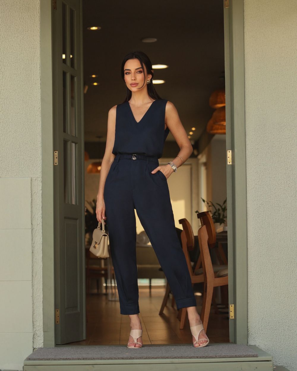 A Calça Em Viscolinho Com Pregas E Cinto Milalai, foi todo confeccionado em viscose mista confortável, macio de toque suave ao corpo. De modelagem reta, possui pregas, bolsos faca, fechamento frontal por zíper e botão, detalhe com pregas e zíper na canela. Acompanha cinto com fivela dourada.