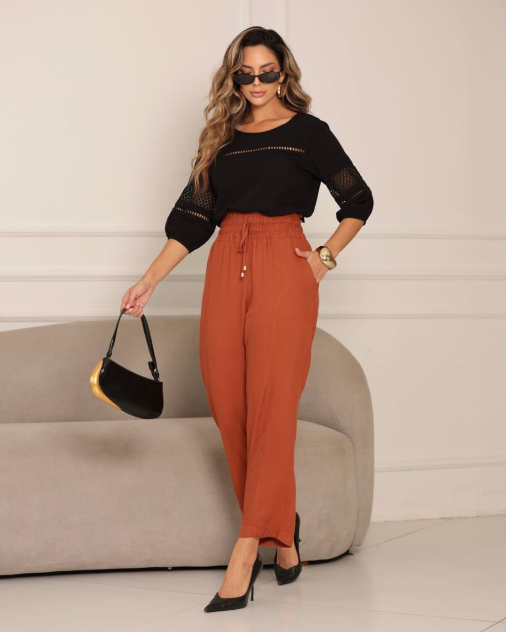 • Calça Em Viscose Com Pregas e Amarração, composição do tecido, 100% viscose, para maior conforto ao vestir.