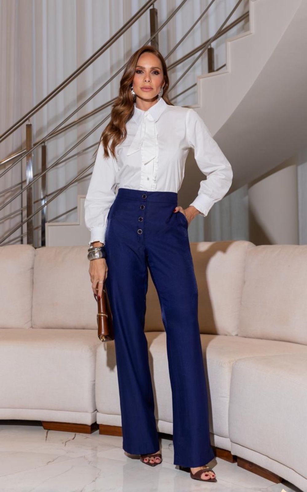 A Calça Reta Em Alfaiataria Com Botões Frontais, foi confeccionada em alfaiataria, modelo reta, tecido encorpado, dando muito caimento a peça, calça com cintura alta, bolso faca, e bolso posterior, possui forro. Fechamento frontal por botões, para deixar a peça ainda mais moderna e sofisticada.