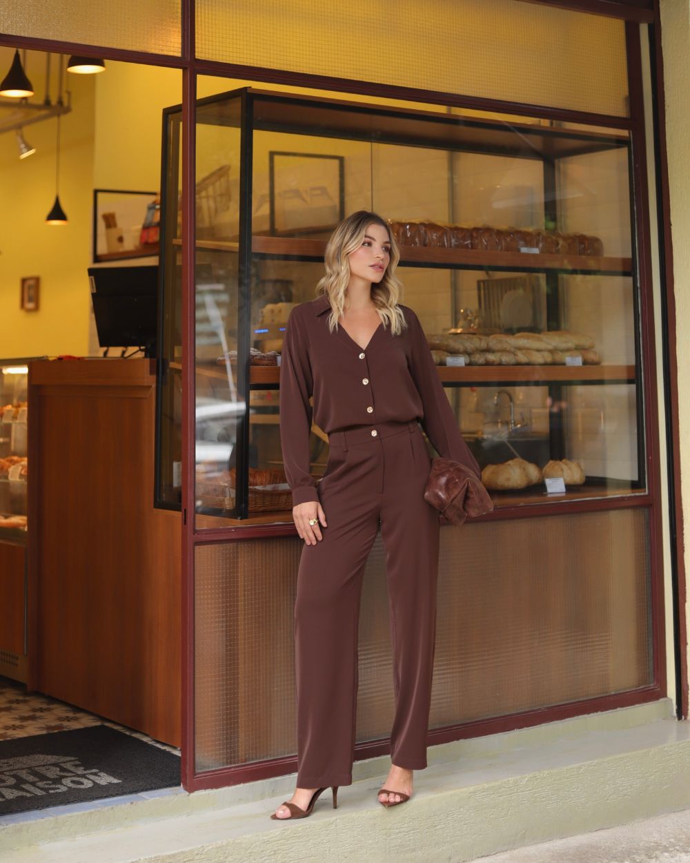 Calça Reta Pregas Botão Orgânico Doce Flor Composição