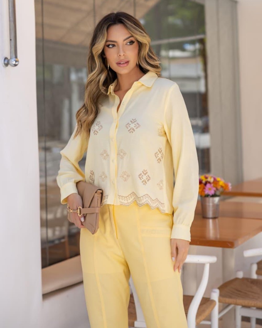 Camisa Manga Longa Com Bordado, foi confeccionada em tecido viscose misto macio de toque suave ao corpo, modelagem reta, decote v, manga curta, detalhes com bordado, possui gola. Fechamento por botões. Moderno e sofisticado, look sensação do momento!