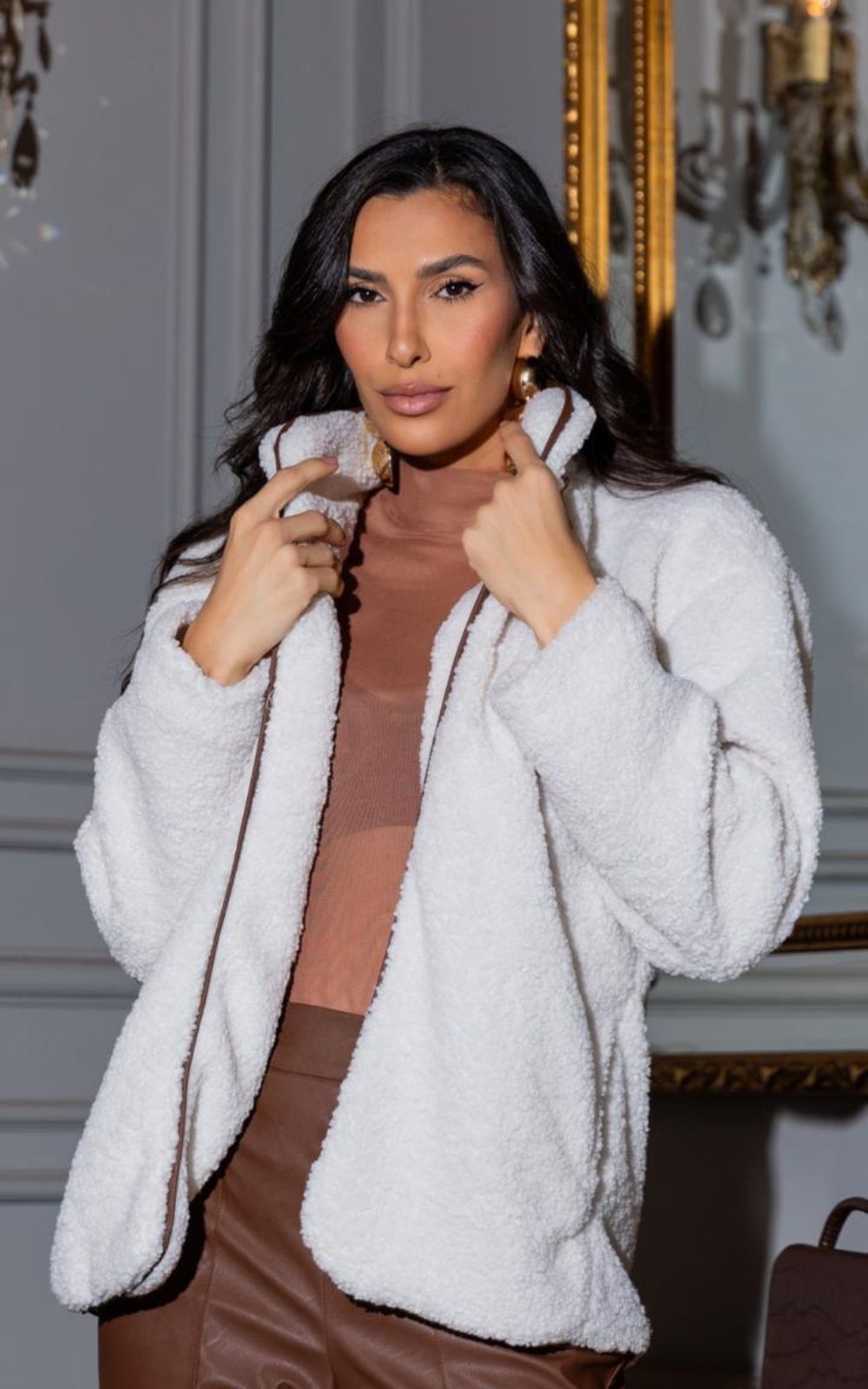 O Casaco Carneiro Com Gola Alta, foi confeccionada em tecido com textura macia e aconchegante, ideal para os dias mais frios. O modelo possui gola alta, que proporciona mais proteção térmica, além do acabamento contrastante no marrom, que valoriza o design da peça. Possui manga longa e bolsos, todo forrado por dentro.
