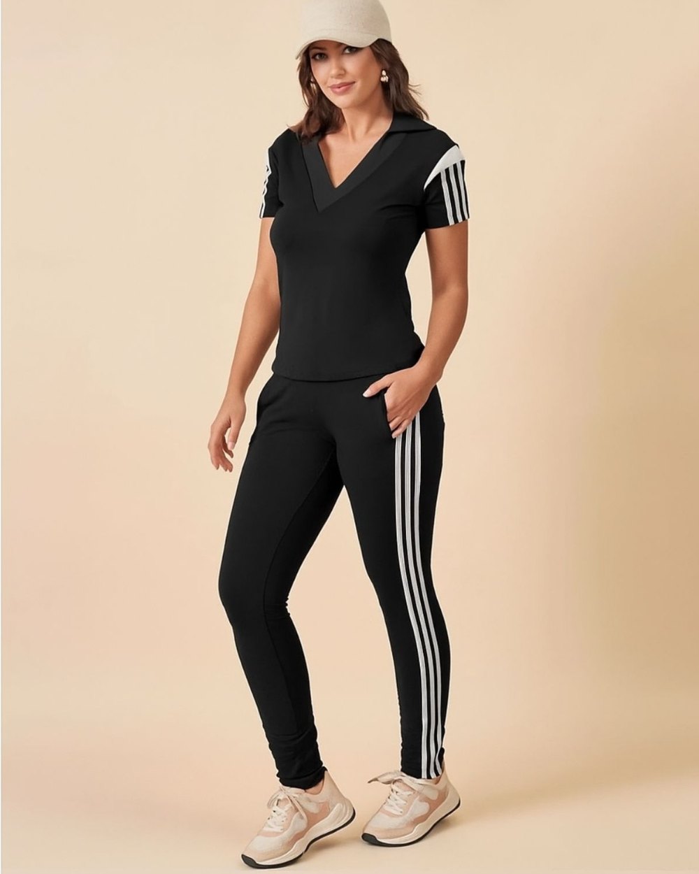 O Conjunto Moletinho Blusa Decote Em V Com Contraste Bicolor Nuxx, foi confeccionada em tecido moletinho, macio de toque suave ao corpo, é composto por 2 peças, sendo: 1 Blusa com manga curta , gola em V,com detalhes em Contraste Bicolor , modelagem reta, 1 calça cintura alta, elástico na cintura, detalhes com bolso faca e fita no cós. Moderno e sofisticado, look sensação do momento!