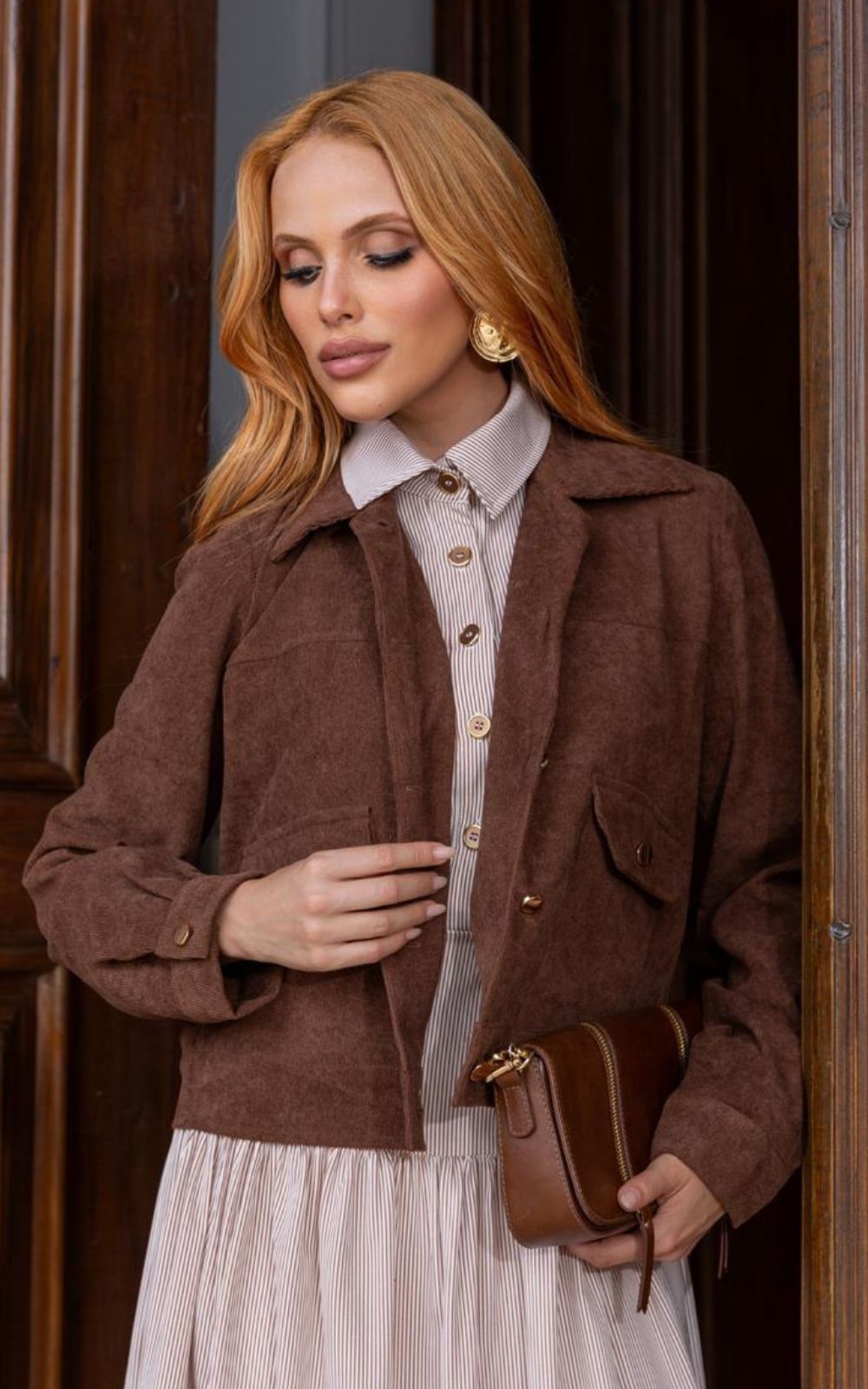 Jaqueta Em Veludo Cotelê Com Bolsos Frontais, confeccionada em veludo cotelê, leve modelagem curta, tecido encorpado dando muito caimento a peça, possui bolsos utilitários com lapela e botões frontais dourados, manga longa, fechamento frontal por botões, para deixar a peça ainda mais moderna e sofisticada.