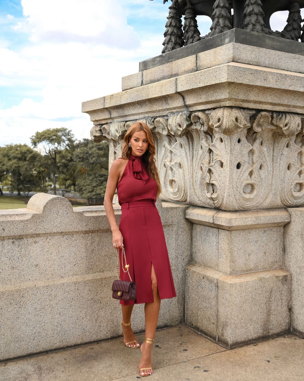 Saia Midi Com Pregas E Fenda Doce Flor Composição