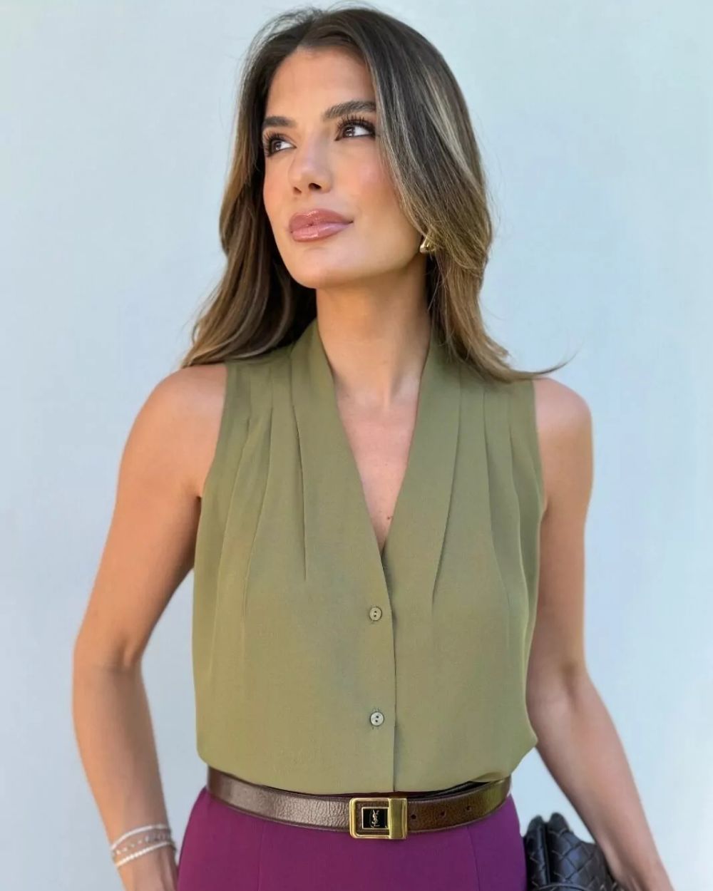 A Regata Com Pregas No Ombro Doce Flor, foi confeccionada em crepe macio e de toque suave ao corpo. De modelagem solta, regata (sem mangas) com detalhes em pregas nos ombros, decote em V Com botões frontal, para deixa-la ainda mais linda e elegante.