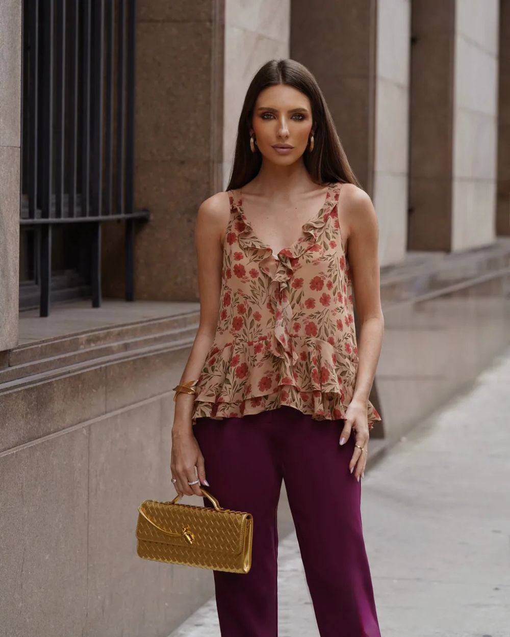 Regata Decote V Com Jabots Doce Flor, confeccionada em crepe floral macia tecido encorpado dando muito caimento a peça, decote v com detalhes com jabots,Conta com babados duplo na barra, regata (sem mangas )para deixar a peça ainda mais moderna e sofisticada.