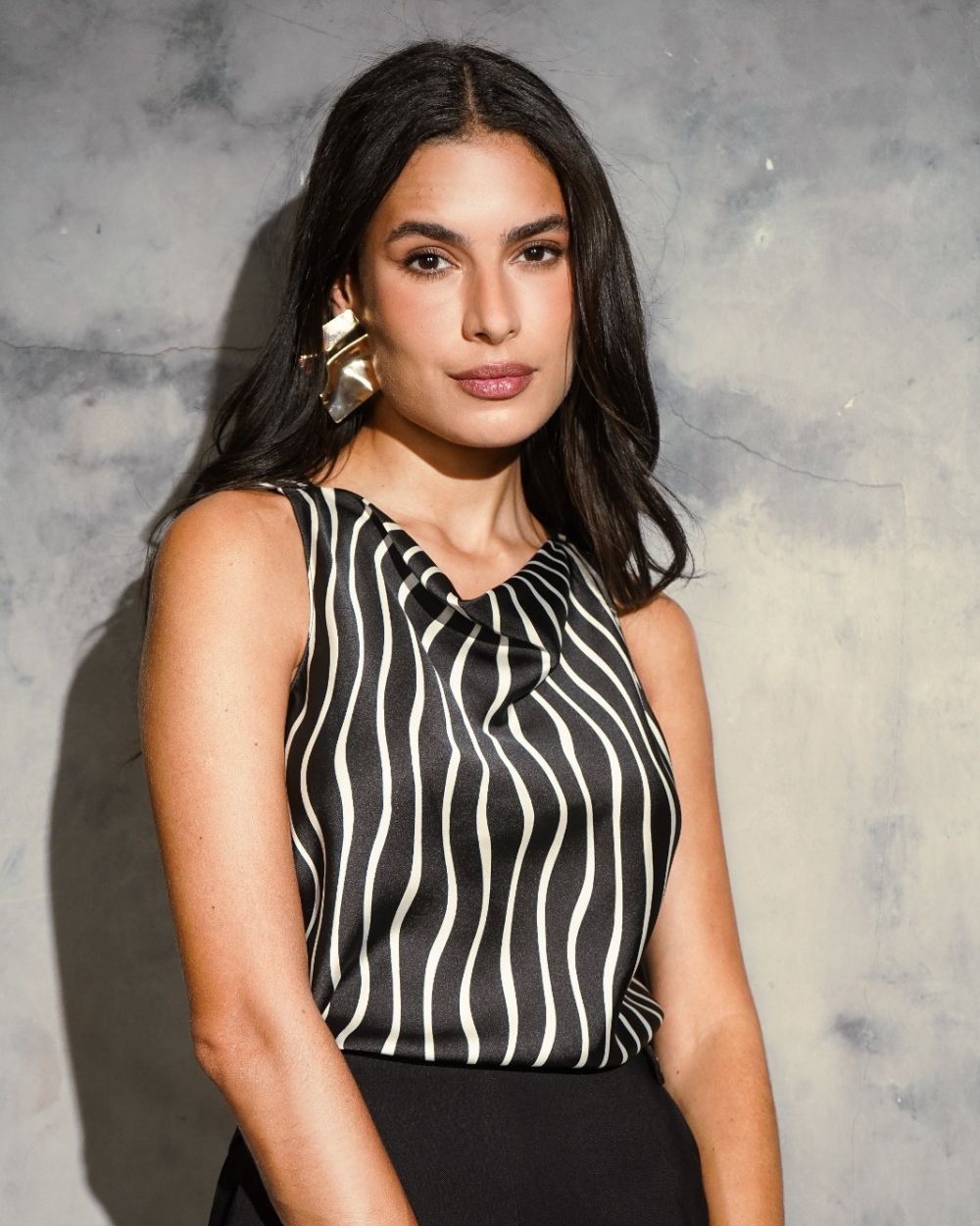 A Regata Degagê Listrada Donna Ritz, regata confeccionada com tecido cetim listrado, tecido encorpado dando muito caimento a peça, possui decote degage .Para deixar a peça ainda mais moderna e sofisticada.