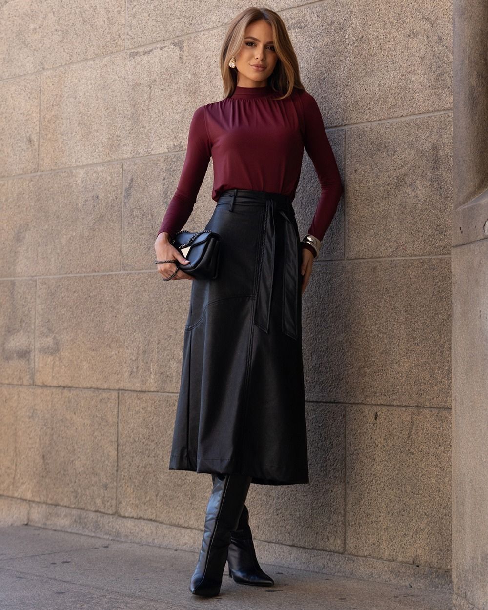 • Saia Midi Couro Sintético Evase Com Cinto, composição do tecido é 100% P.U, 100% Poliuretano, para maior conforto ao vestir;