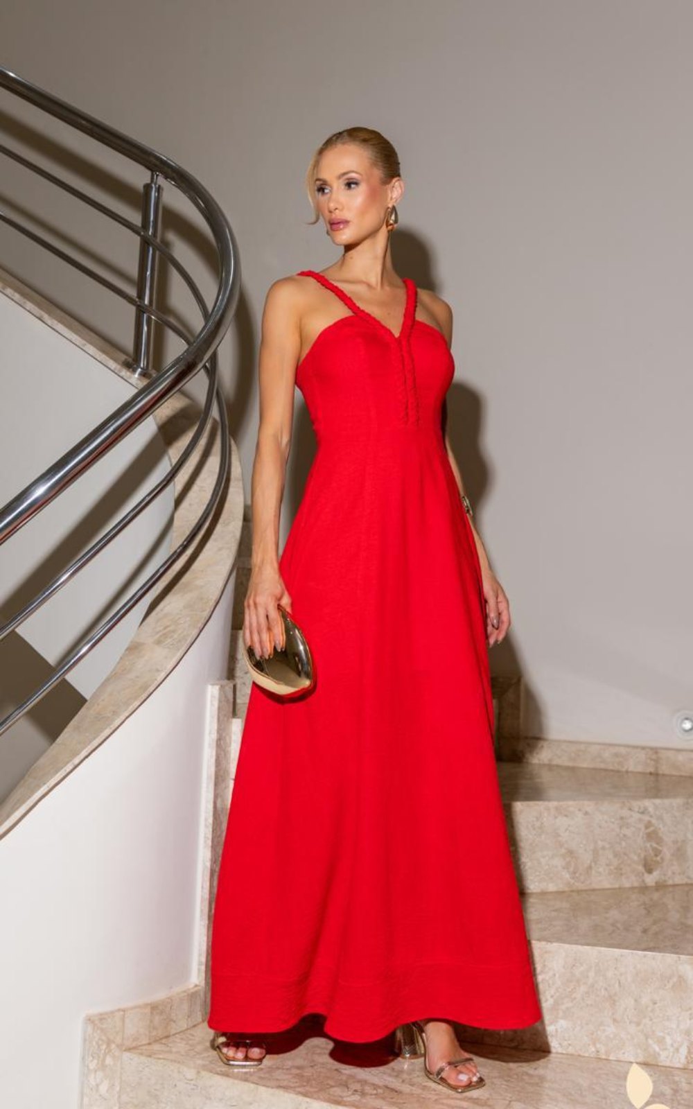Vestido Midi Alfaiataria Decote V Alças Trançadas