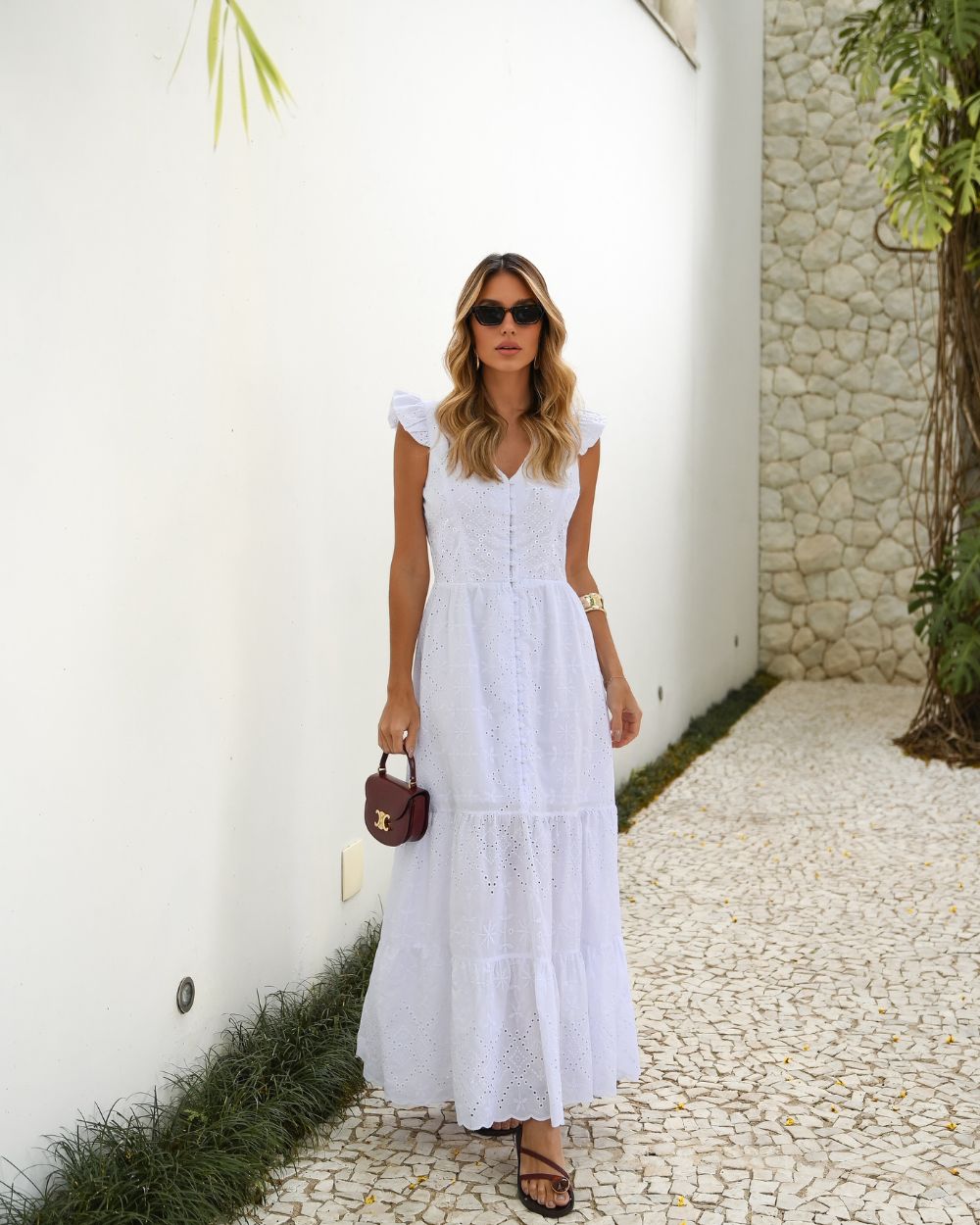 • O Vestido Midi Em Laise Decote V e Botões Milalai, composição do tecido, 100% algodão, forro 100% poliéster para maior conforto ao vestir;