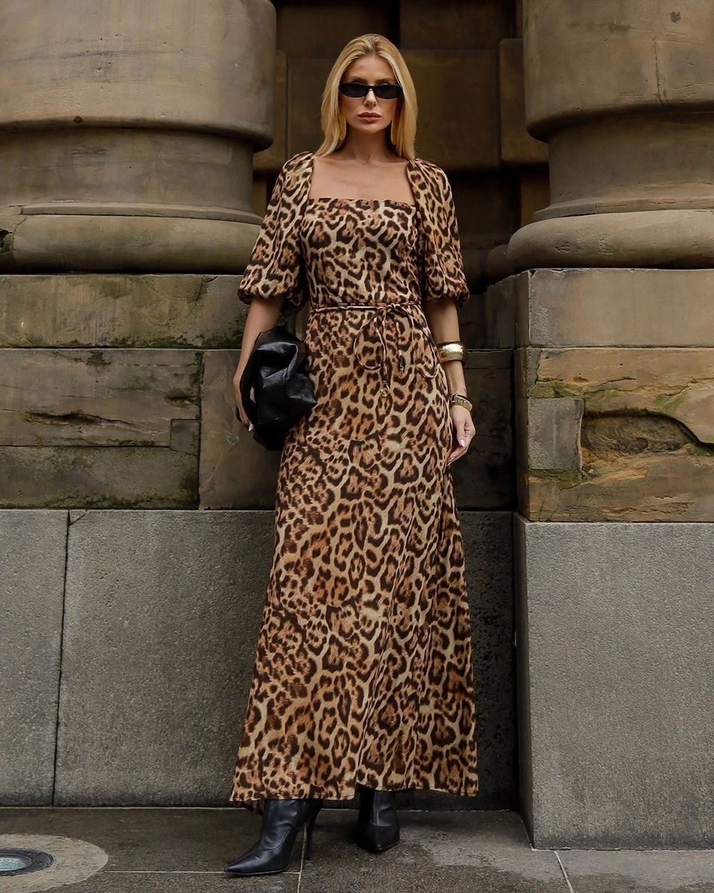 O Vestido Midi Em Viscose Decote Quadrado, Vestido midi em viscose estampado animal print. Possui faixa para amarração, manga 7/8, com elástico, lastex nas costas e forro. Vestido fica lindo no corpo você tem que ter um!!!