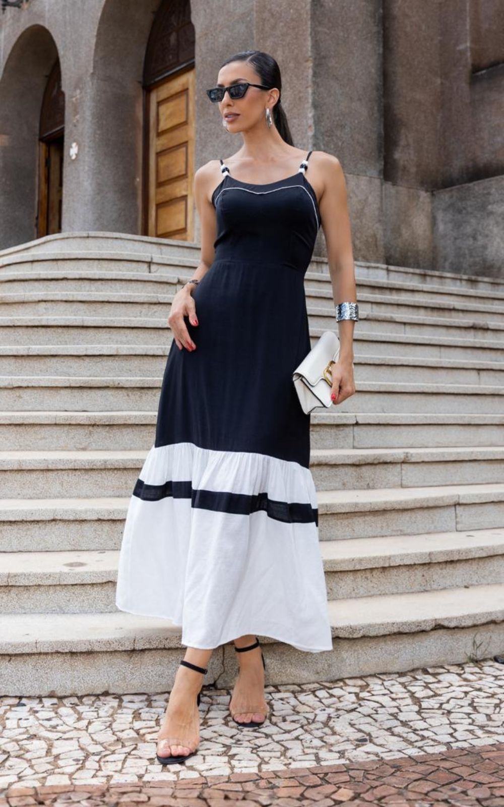 O Vestido Midi Em Viscose Decote Redondo E Alças Finas, foi confeccionada em tecido viscose misto macio de toque suave ao corpo, modelagem midi, decote redondo, alças finas e regulavéis, e aplicação de pedrarias, em resina e formas geométricas, detalhe com pesponto aparente no decote, que cria um efeito suave e feminino, valorizando a região com delicadeza, saia com modelagem evasê, com recortes horizontais e faixas contrastantes bicolor (preto e branco), possui forro. Fechamento posterior por zíper. Moderno e sofisticado, look sensação do momento!