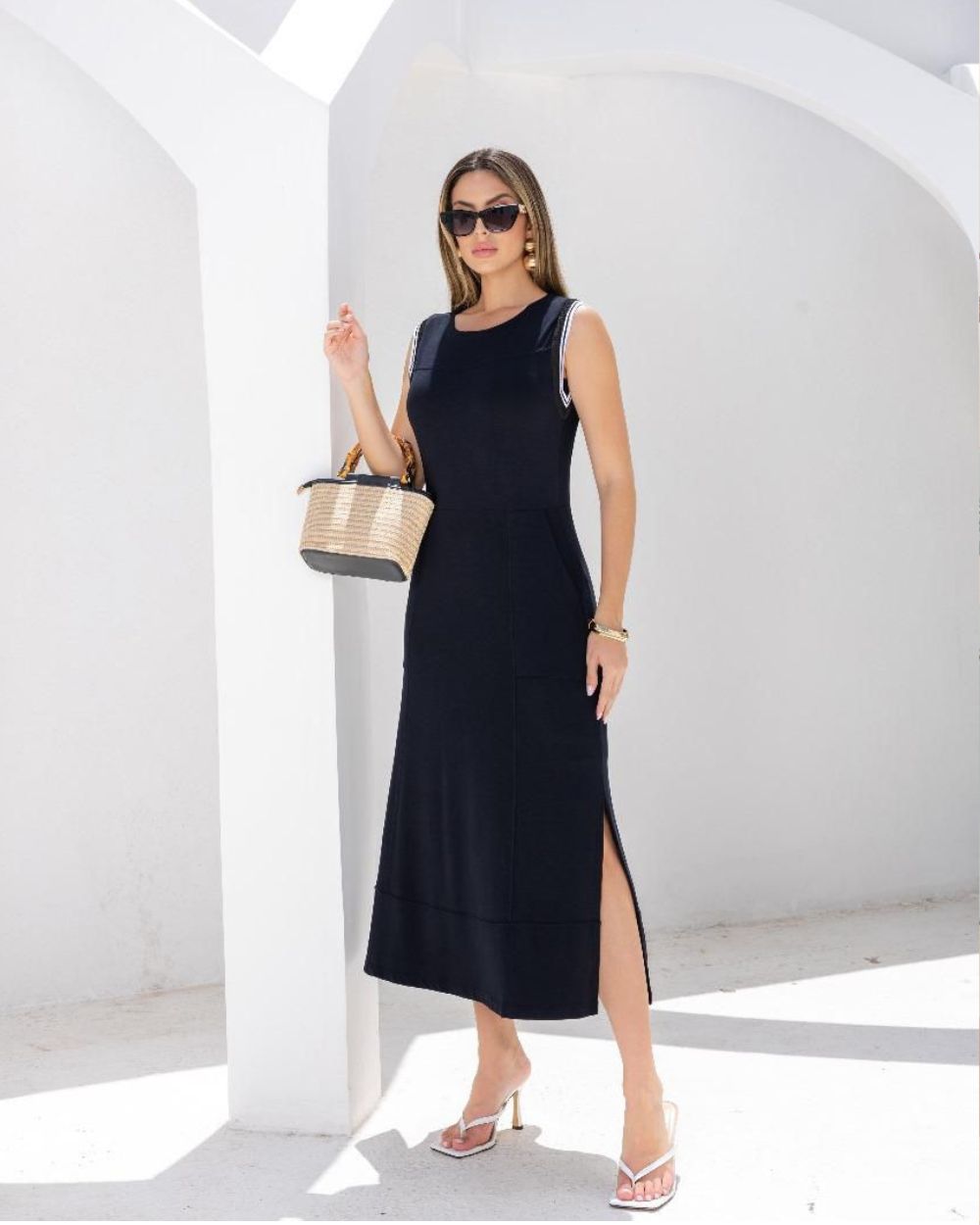 Vestido Midi Moletinho Com Fenda Lateral, confeccionado tecido viscose misto, macio de toque suave, Possui decote redondo, comprimento midi, com bolso faca, regata, com fenda lateral, para valorizar a silhueta feminina. Requintado e extremamente confortável, tem que ter!